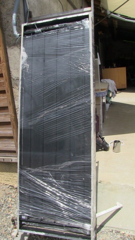 Enfin pour l'eau sanitaire l'été quand il y a du soleil j'ai construit un petit panneau thermique d'1m² environ toujours a l'essai il n'est pas fini je dois lui trouver une vitre. En attendant c'est du plastique transparent en rouleau que j'ai tourné autour pour faire vitre ...